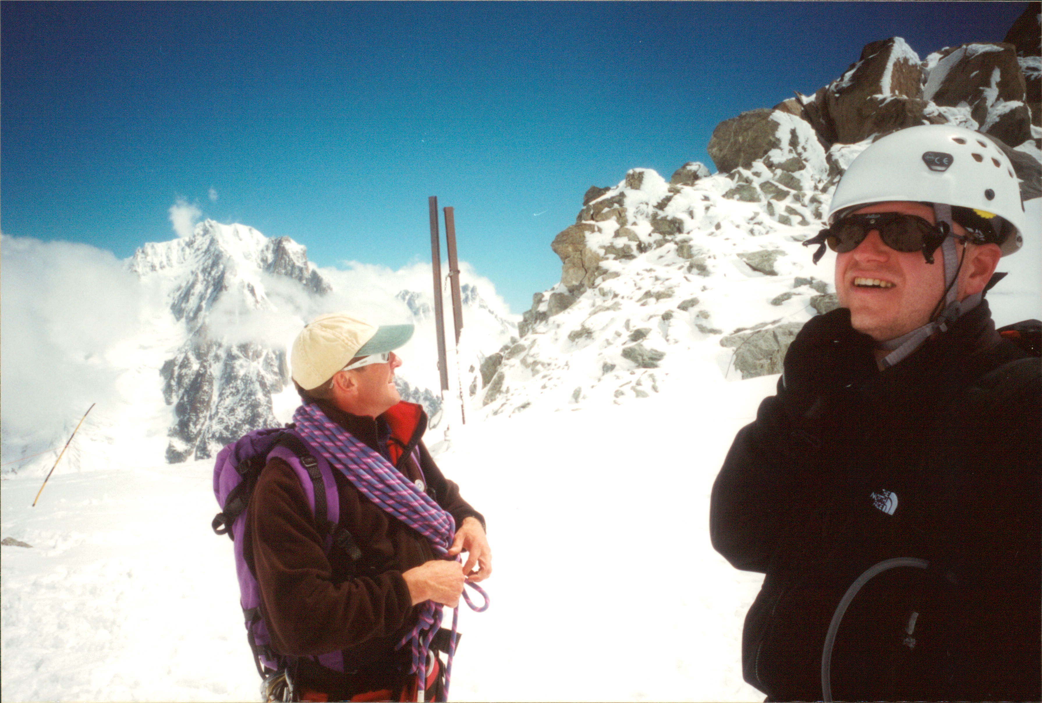 One of several climbing days was during July 2000 with John Lee in Chamonix. This route is up Le Petite Aiguille Verte, a short route above Le Grand Montets ski lift in the Argentiere Valley area. On the way to the summit, we were passed by the all-female Swedish National climbing team. I have never seen such large and strong women. They totally kicked our ass on the mountain.