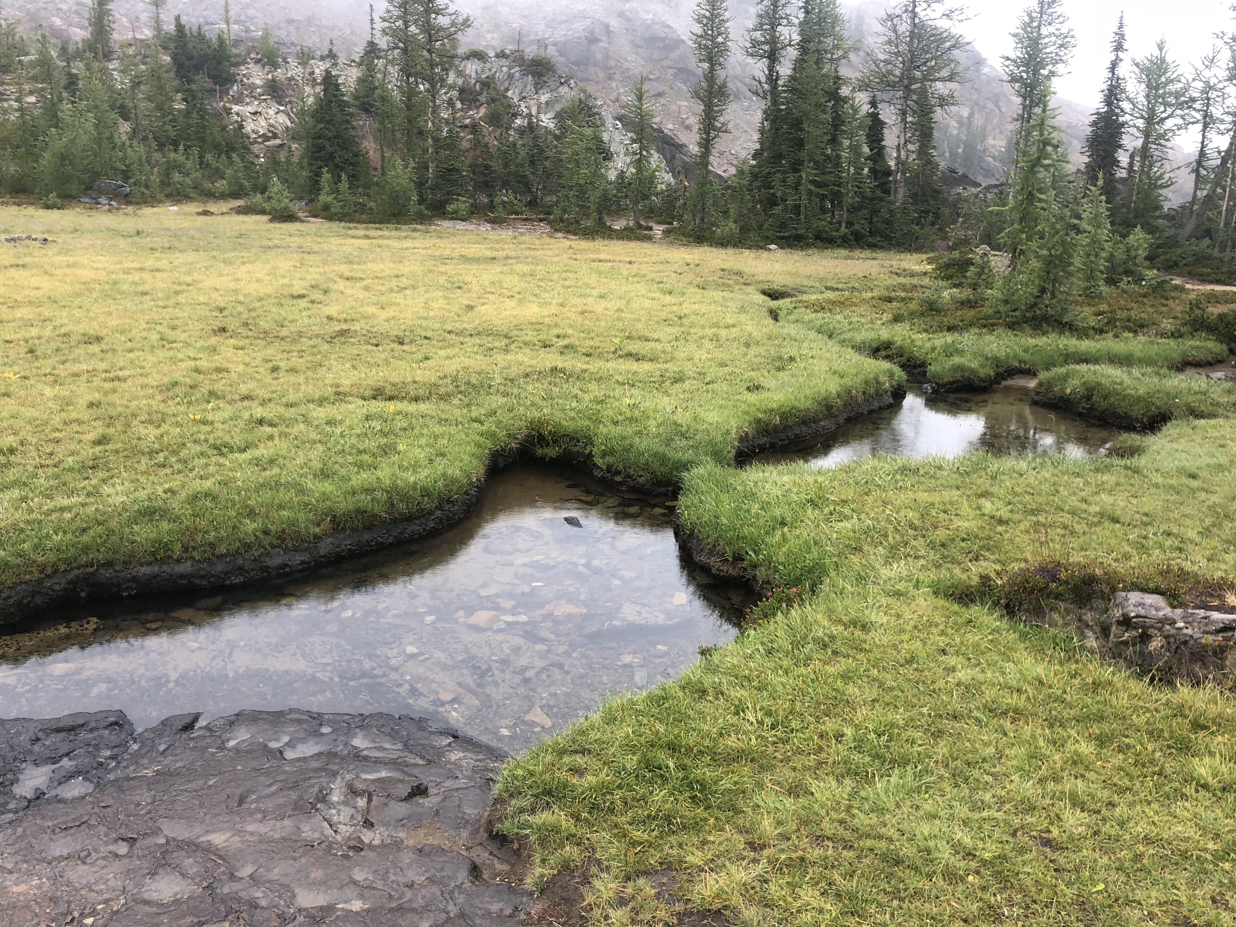 This area is truly spectacular, and frankly, I enjoyed the terrain and flora much more than the lake.  If you lose the trail – look for cairns and dirt paths ahead. Keeping on the trail is relatively easy, especially using a map or an app. You finally will cross a rocky area with large boulders and skirt over large rock slabs to a slight scramble, which navigates up and over the final pass to the lake. This is the only tricky bit of the trail. Part of it was covered in mud, and the rocks were slick in the wet weather.Â