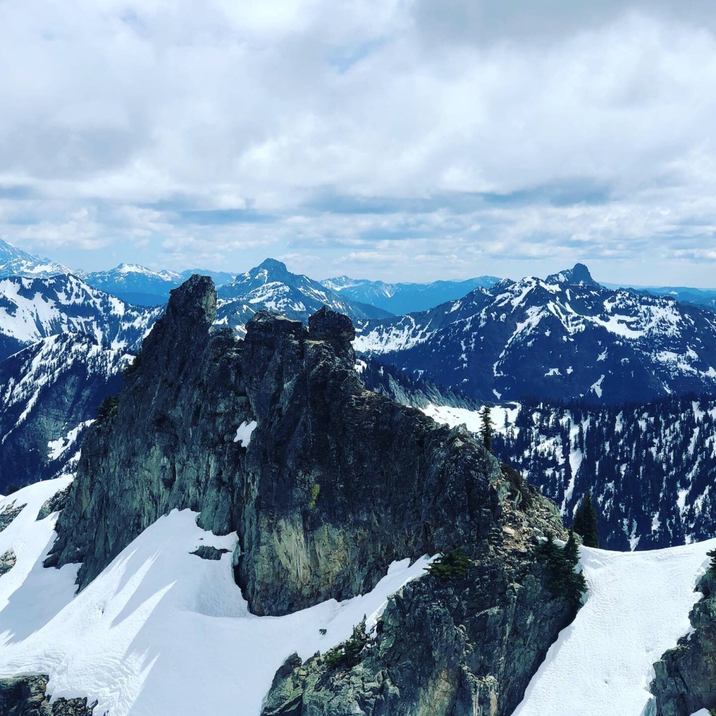 Day trip with the Mountaineers. The trail up to the junction for Guye peak is now completely snow-free. The stream bed is also mostly dry and the trilliums are blooming! Continuing up and to the left, the stream crossing is easy and the water is flowing beautifully. The trail continues up the steep tree gully and some intermittent snow persists. Once you clear the forest and gain the subalpine terrain, there are snow patches to cross. We used ice axes to assist with the ascent and aid potential falls. Snow is at the summit. The day was cloud free in the early AM, but afternoon clouds began to blow in. Perfect 360-degree views everywhere! Most of the Home Court 100 was visible as well as the Alpine Lakes area. Amazing to see Snow Lake, frozen and still covered in snow.