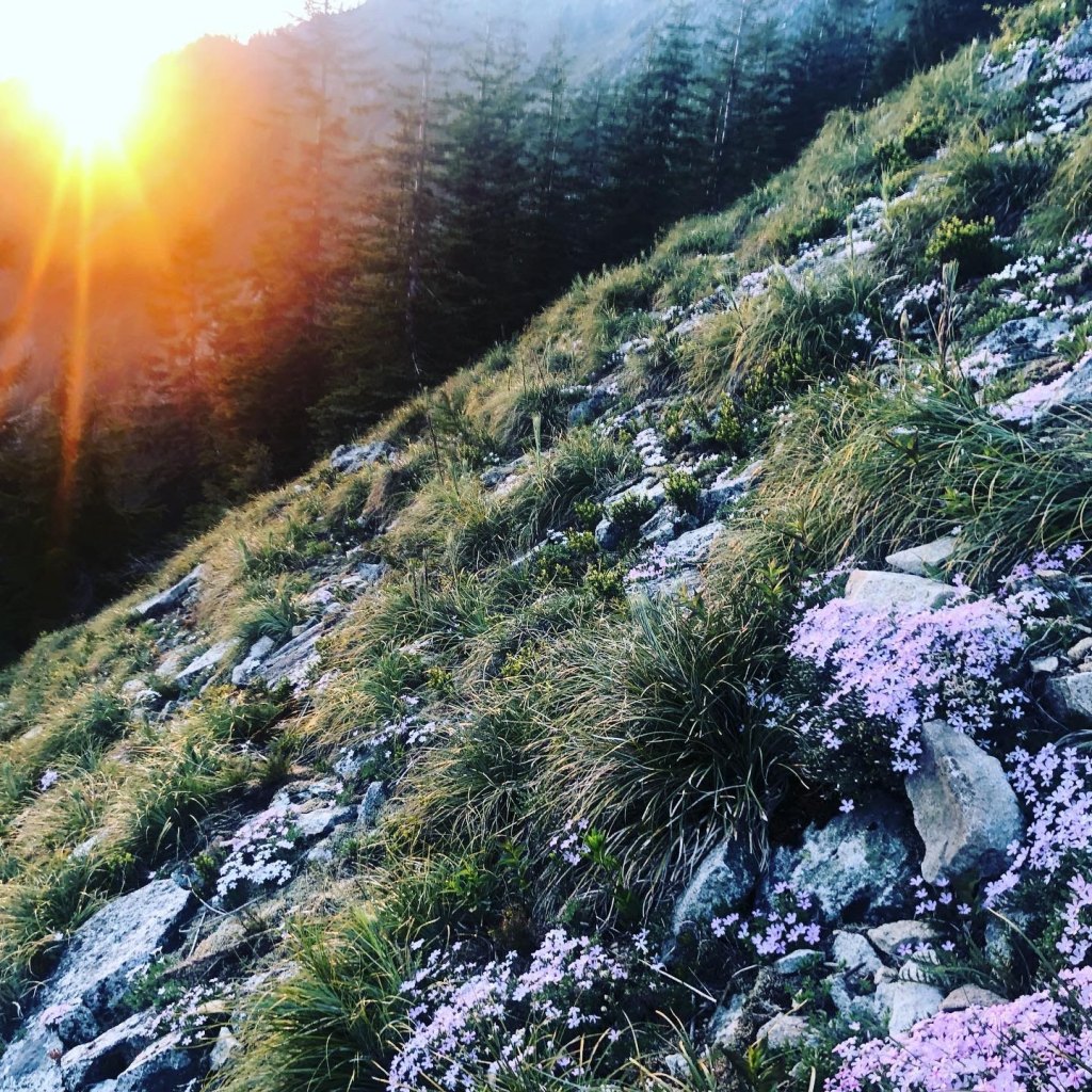 Sunset hike up PPP. Beautiful views once we cleared the tree line. Love the ridge hike up. Lots of beargrass blooming, and beautiful carpets of phlox above the trees on the rocks. Summited at 9 PM and made it back to the car at midnight – dicey coming down in the dark. The trail is dry all the way! No mud in the forest sections.