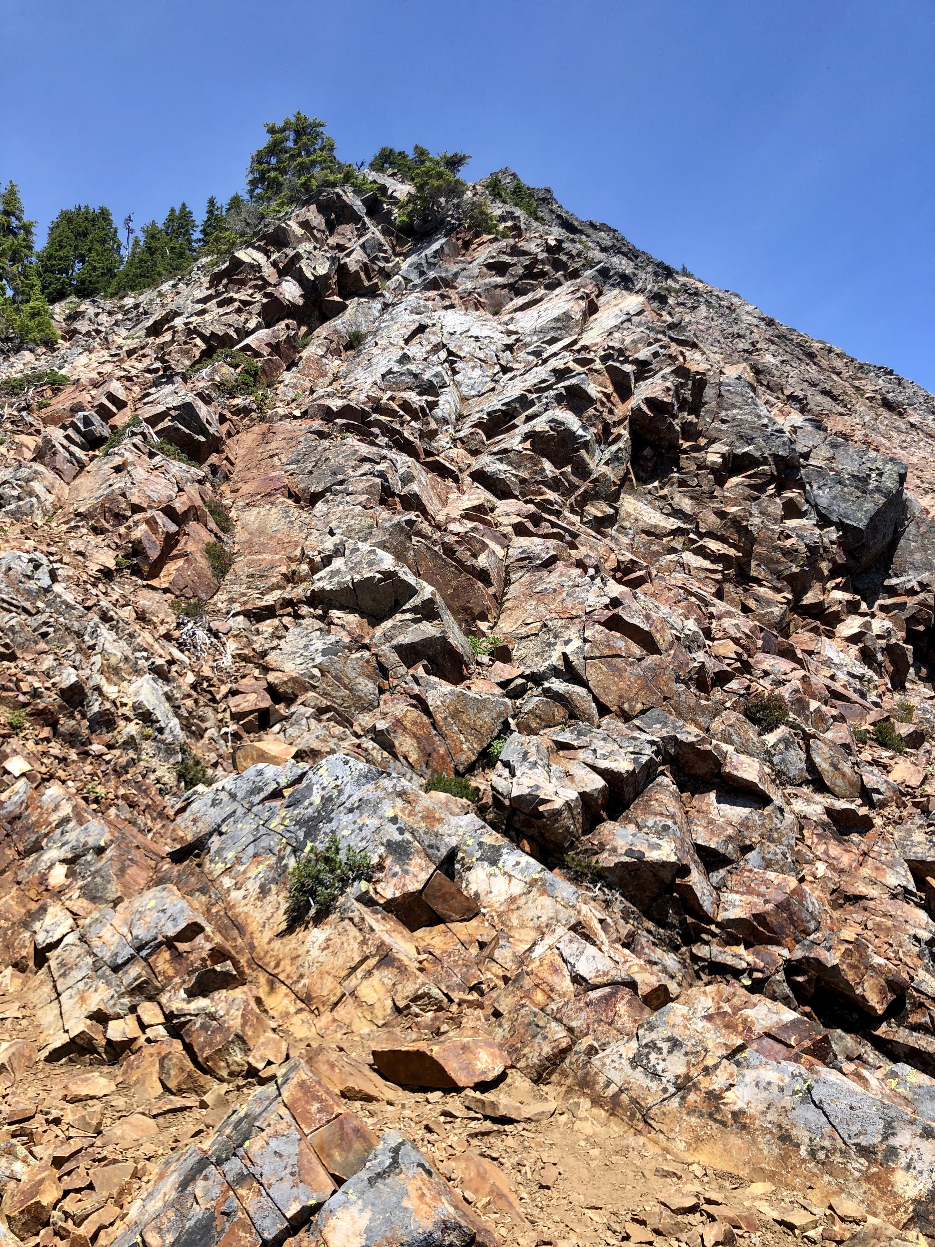 The trail gets interesting about 1/3rd the way up, with some good scrambly horizontal traverses across roots and cracks in the rocks. After reaching a ridge/point, the path goes upwards, Class 2, with lots of loose rock. It’s easy to lose the trail upwards, and it was also interesting to see a few groves of very large trees growing into the steep rock – fortunately, they provided a needed respite of shade from the sun.Â