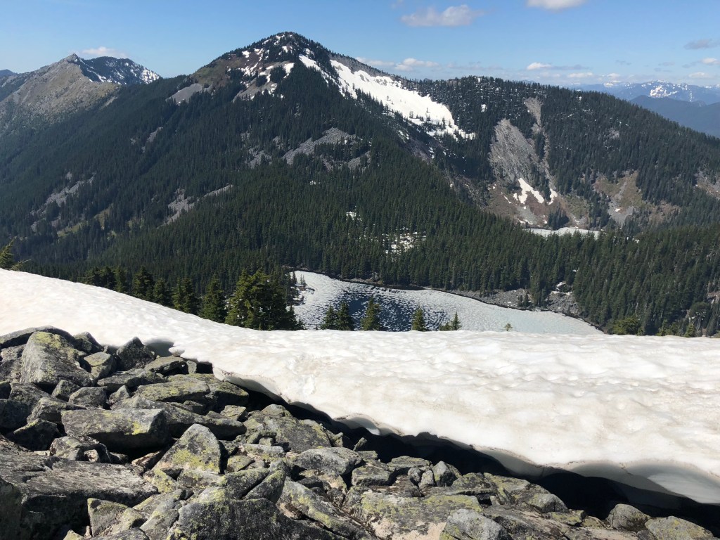 Day trip up to little Bandera. The weather was great. Lots of Beargrass in bloom. Super views of Rainier, Mount Defiance, Mason Lake (still mostly frozen), and other lakes in the area. Opted to not continue past the rocks at the top of Little Bandera as there was a bit of snow, and lack of visible trail continuing towards the Bandera Mountain summit.