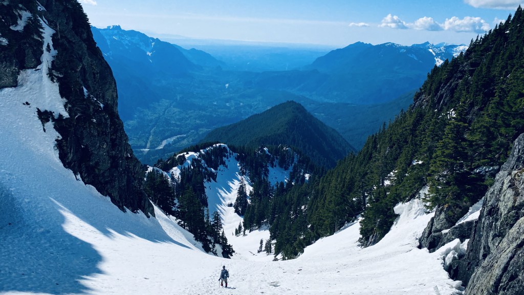 Unkle and I made the summit which was fairly easy and we enjoyed a few minutes of the views which are spectacular. I love how you can see down the Skykomish valley, out towards Puget Sound, the Olympics and even the Seattle skyline – much of the Alpine Lake Wilderness is visible as we enjoyed a different vantage of many of the peaks from the north. We descended quickly to the snow wall and hoped that the steps would be in decent condition and not too soft from the sun. I recall the other climbers commenting after pausing to chat with us, that “the wall would not climb itself”, so I took lead on the descent, careful to rekick in the steps as the snow was soft, and ensuing my axe was securely plunged with each step-down. We each took the wall down separately so if one of us fell, the other would not take out the other. After 10 minutes of down climbing, we reached the saddle and began a rapid plunge-step descent.