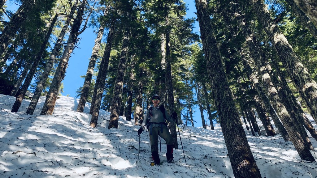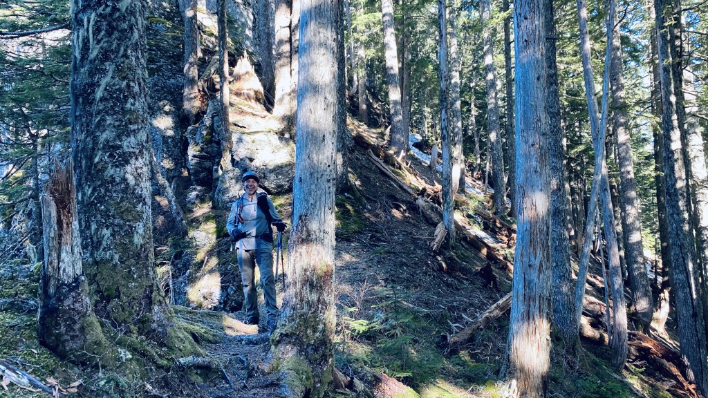 We made the ridge in just under two hours including our unplanned circuitous route-finding and cliff band navigation and began a quick traverse to the beginning of the basin. We figured we were making pretty good time for a couple of old guys and would have the summit in no time. The ridge is an absolutely gorgeous walk, with lots of mossy rocks, and amazing views to the left. As we approached the area where the path veers off the ridge as it eventually will cliff you out, we followed the flagging which appeared to follow the summer route. Much of the time we were able to follow some boot tracks, but somehow the snow was too hard for these to persist and we generally kept to the right and headed up. Note, it is best to keep left and try to hug the ridge as close as possible in our post-trip assessment – we descended this route as you can see from our GPX track which was a much better route – I wish we did this ascending. Although steep, it would have been much easier and would have saved us a bit of time as well. We ended up losing the flagging and traversed around for about two hours up steep forest slopes, trying to avoid a series of rocky outcrops and other steep terrains. We were in crampons here and I suggest putting these on sooner vs. later. I was not sure from the terrain if we were aiming for what ended up being the correct saddle to the left or if we needed to go right of the rocky ridge which ended up being the direct ridge to South Baring. We initially were going directly up the ridge leading to South Baring – in retrospect a navigation error. We eventually veered left and saw blue sky which I assumed was the path to the pass leading to the basin and the beginning of the next stage of the climb.