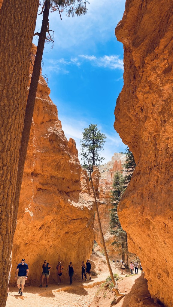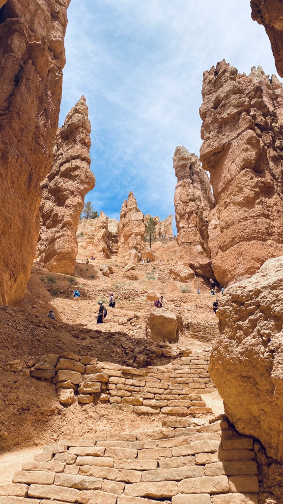 We connected the Navajo Loop trail with the Peek A Boo Loop trail which is commonly known as the Figure 8 loop to experience the southern part of the canyon. The trail descends steeply into a narrow slot canyon called Wall Street. Fortunately, we descended as it was rather steep. This is an amazing geological trail to hike into and you can see the grade from the many people switchbacking up and down the trail. There is a lone Douglass Fir tree at the base of Wall Street growing precariously in a very tight canyon space and is famously photographed. It was awesome to finally visit this part and see these amazing and magical natural formations in person and be able to hike so close and navigate near, next, and between them all. Carl and I hiked the full Figure 8 loop and ascended to see Thor’s Hammer as our finale on the final ascent.