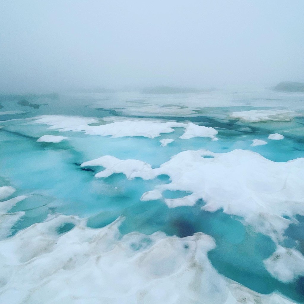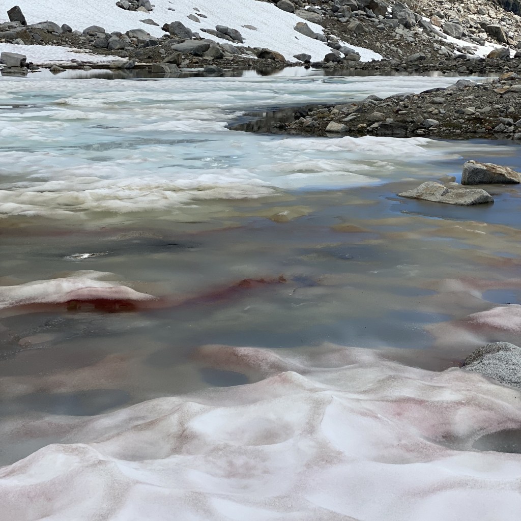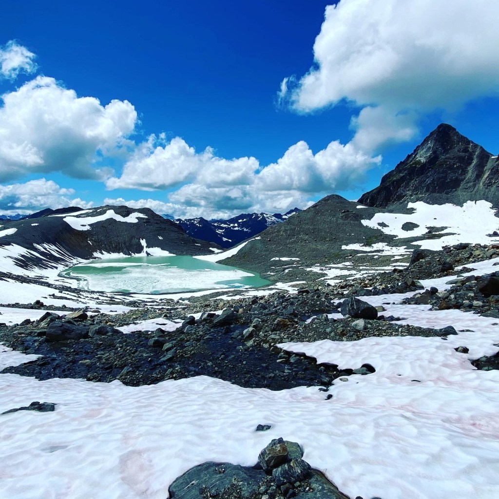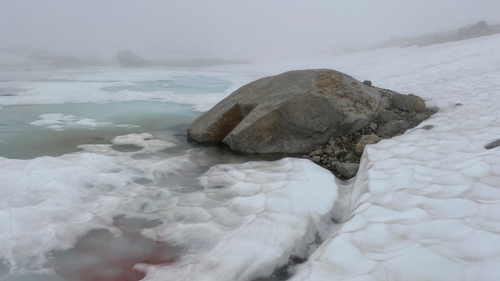 Without discernable landmarks, we lacked the perspective to really appreciate the scale of our environment, and also had no clue where the destination was from a visual perspective. The clouds created an otherworldly wasteland-like atmosphere with the rocky terrain, semi-melted glacial tarns, red algae, and terribly interesting rock formations. In retrospect, Jamie and I were glad it was cloudy as the visuals of the terrain were unique and led to an air of mystique and wonder of what was veiled within the clouds.
