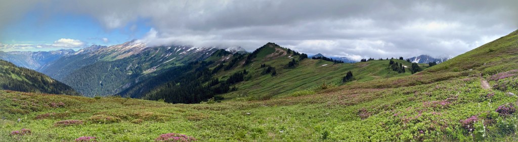 After 5 miles of fast, flat hiking, we encountered the dreaded switchbacks – there is a lot written about how hard and miserable these are, and while ascending the switchbacks, we encountered a hiker who said we were entering the suffer-fest. I think that given we hike a lot in the I90 corridor on hikes like Mailbox Peak and Teneriffe Kamikaze, and I recently did a few car 2 car summits, and both of us climbed Sloan Peak the prior weekend, that this was not so bad – a bit dusty and the heat was rising, but fortunately much of it was in the shade. We still maintained a sub 30 min mile up the 2000+ feet and 3+ miles. Once through the switchbacks, we hit the long traverse to White Pass. This part of the trail was a small teaser of the alpine beauty yet to come. The hillside was carpeted in wildflowers and mountain heather and was absolutely stunning.