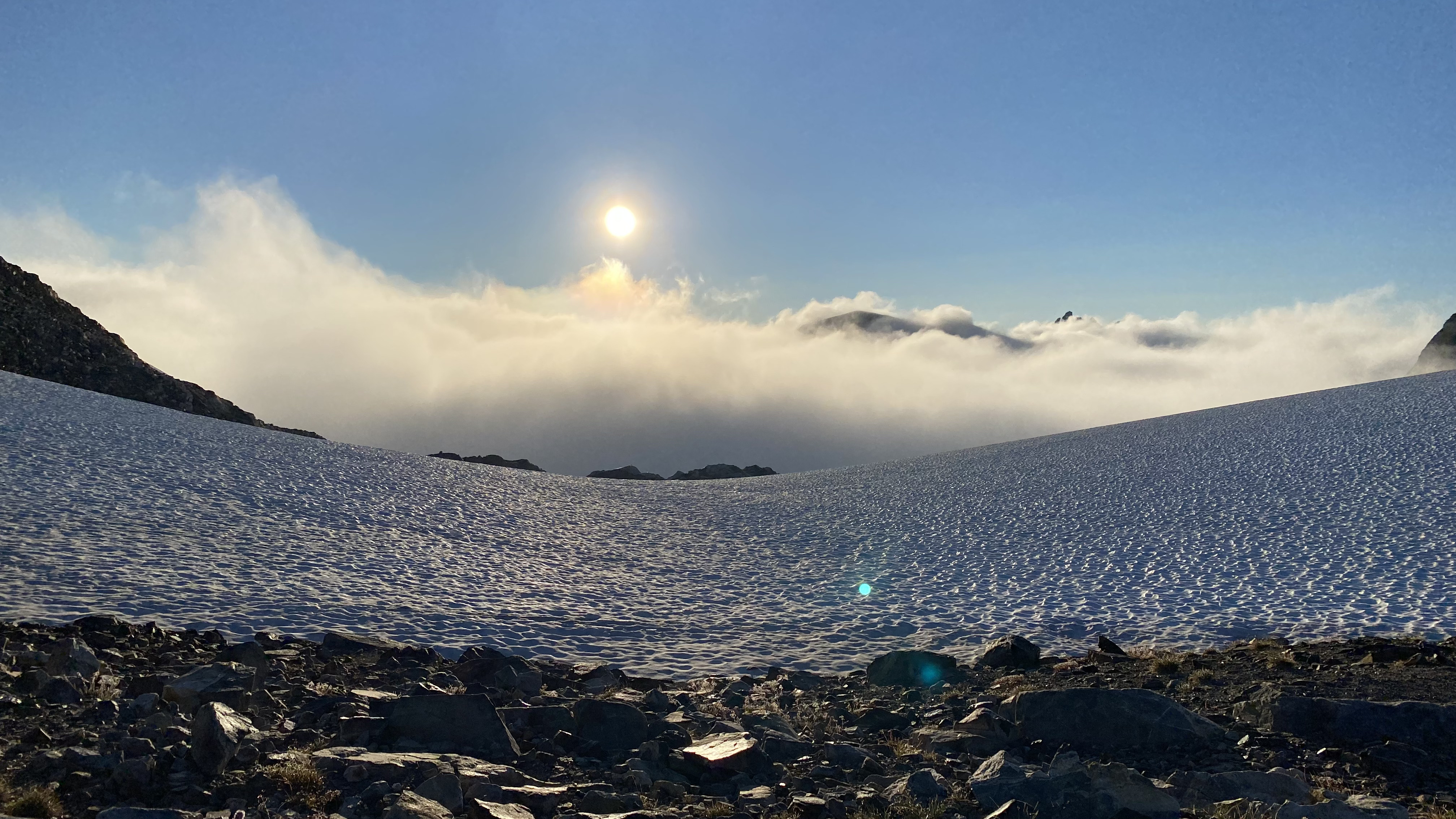 From White Pass, we connected with the Foam Creek trail that takes one to Foam Pass in two miles. The trail continues to traverse the hillside and only continued to get more beautiful with even more wildflowers. We encountered numerous marmots guarding their homes burrowed in the trail. As we ascended the steep slope up to Foam Pass, we were greeted with thick cloud cover. Another hiker said that this view is why people make this climb.