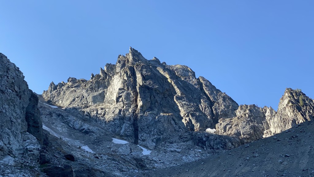 While ascending Leroy basin and following the massive cirque of Seven Fingered Jack, Fernow was not visible and we had difficulty visually identifying the route. As with many peaks, from a distance, Fernow appeared unclimbable. However once at the basin, it looked more reasonable. The route took us up some slabby ledges and follows the outlet flow of the upper snowfield.