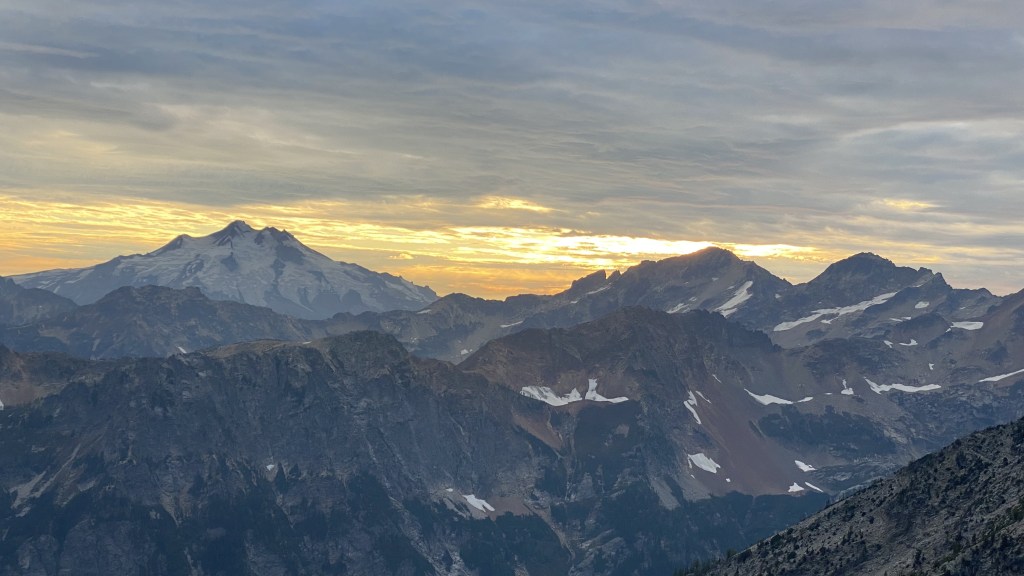 We made pretty good time down and across the moraine and up the final 1000 feet to the ridge. I took my time ascending the sandy ledges as I had some challenges finding a good route, with minimal exposure and I did not want to fall given I was getting tired. Finally, I popped up to join the others and was greeted with an amazing sunset over Glacier Peak.