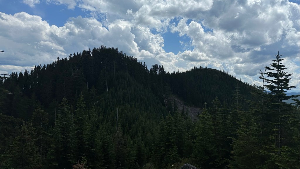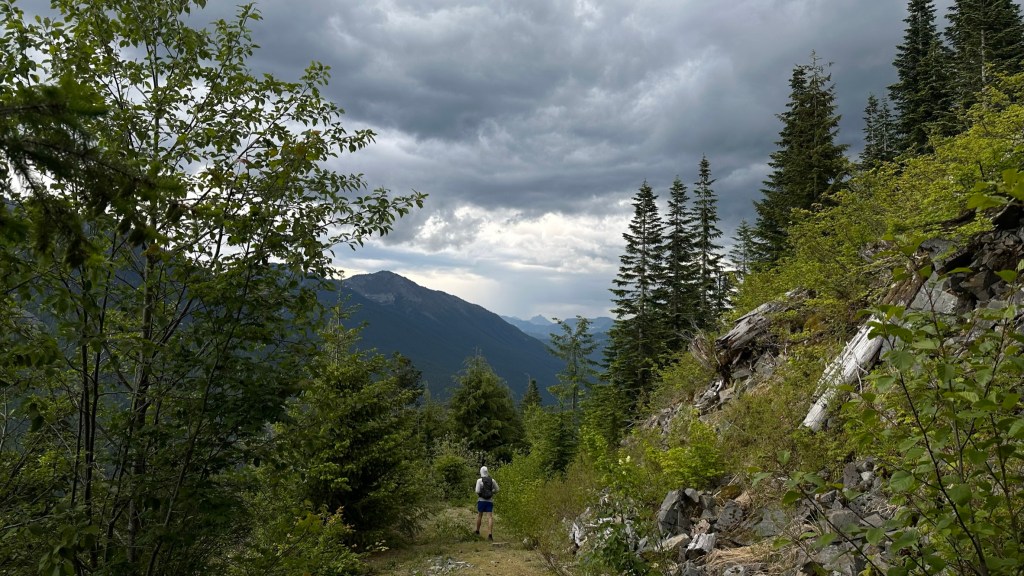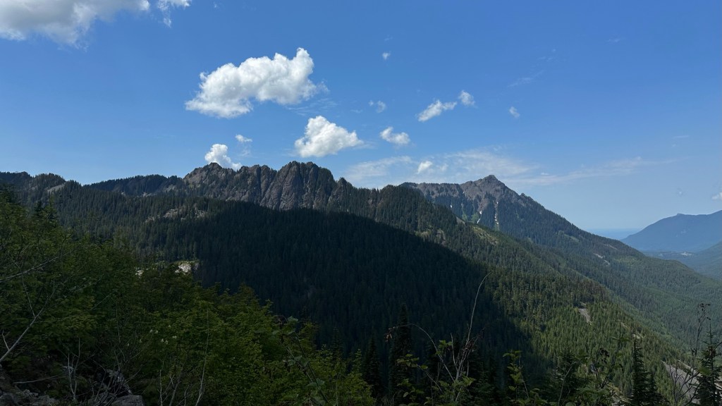 Looking back at our route of the ridge and the Alpine Lake Wilderness in the far distance with Kaleetan Peak, the tooth like peak in view. Clouds were rolling in to provide some respite from the heat. Little did we know that a storm was rolling in.